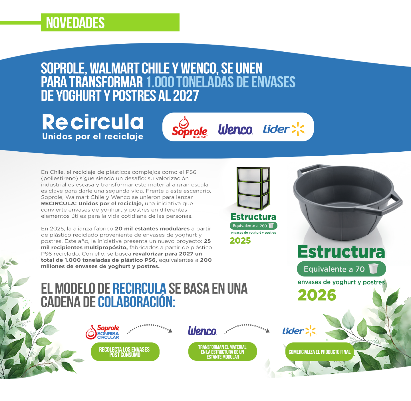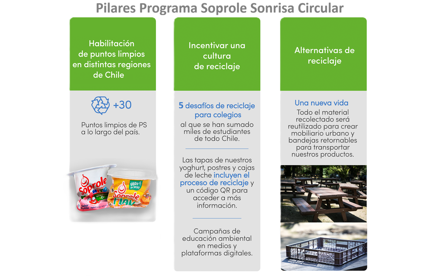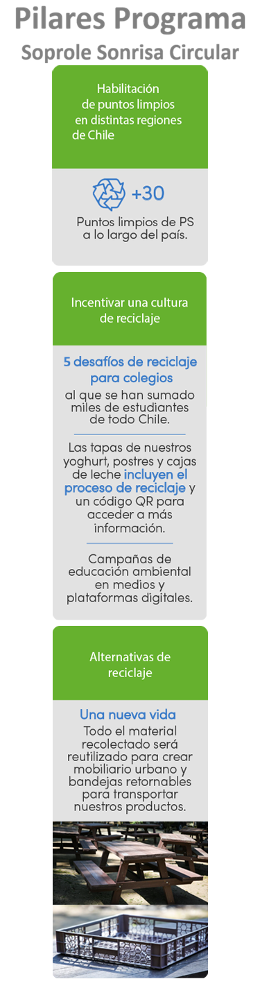 Estamos muy orgullosos de compartir contigo los avances de nuestro programa Soprole Sonrisa Circular, el cual permite por primera vez en Chile entregar una solución integral al reciclaje de los envases de yoghurt y postres elaborados con plásticos PS6. Sabemos que cuidar el medioambiente es tarea de todos, por lo que te invitamos a conocer más de esta iniciativa y que así nos ayudes a que más personas sepan cómo reciclar los envases de yoghurt y postres de Soprole y cualquier otra marca de la industria.