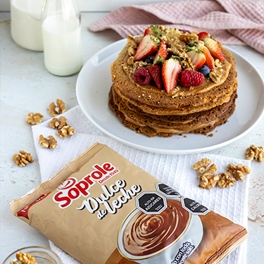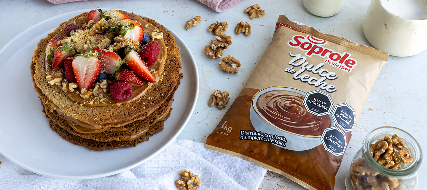300 g de Mantequilla sin Sal Soprole300 g de azúcar300 g de harina sin polvos300 g de nuezDulce de Leche SoproleFrutillasArándanos