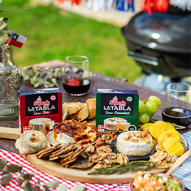 Queso Brie La Tabla Soprole: Coloca tu queso en alusa y haz rendijas como muestra el video. Luego esparce salsa barbeche y lleva a la parrilla. Déjalo 7-8 minutos. Retira y adorna con tocino frito.