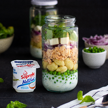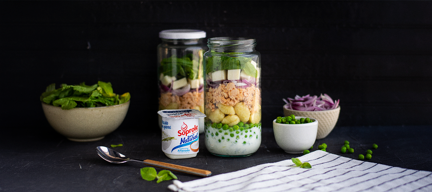 Prepara una fresca y práctica ensalada de ñoquis en frasco, ideal para llevar a donde quieras. El secreto está en armarla por capas: primero, crea un aliño cremoso en el fondo del frasco con Yoghurt Natural Aflanado Soprole. Luego, añade el resto de los ingredientes como pepino, arvejas, salmón, queso y los ñoquis, coronando todo con rúcula. Al momento de comer, solo debes agitar el frasco para que el aliño se mezcle y ¡listo!